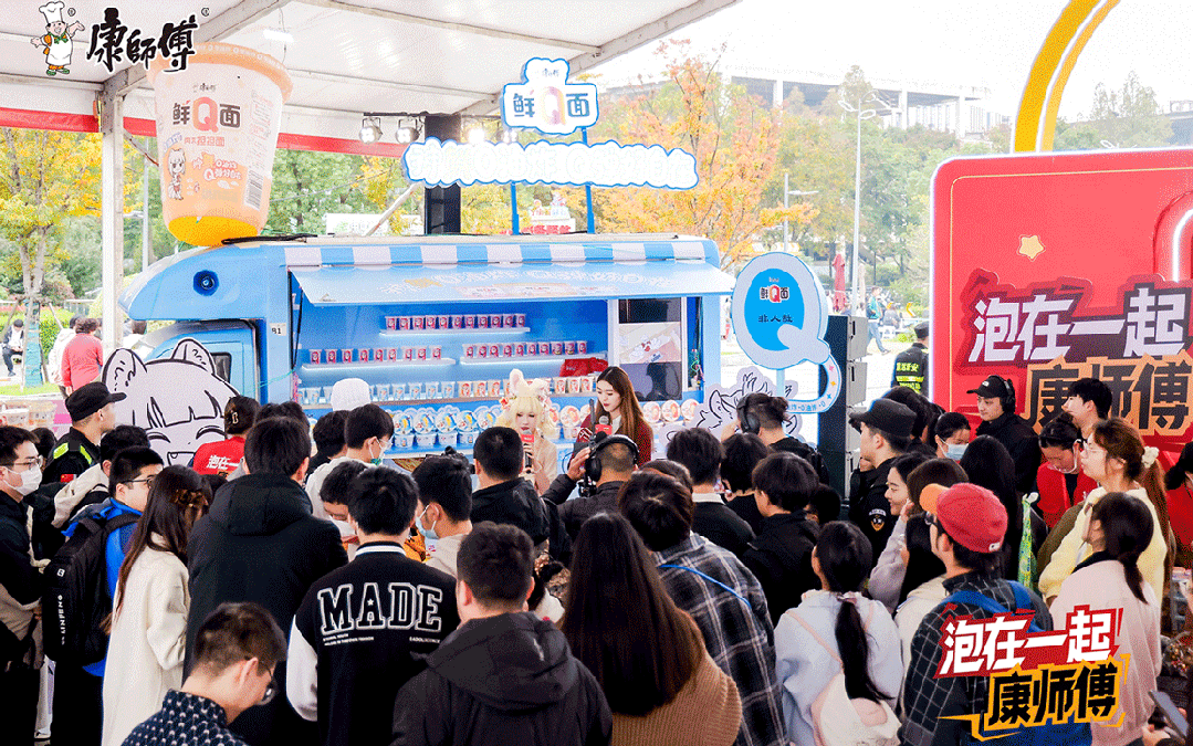 更在康师傅泡面大学南京站向粉丝发起面基邀请,B站顶流UP主伢伢COS《非人哉》萌兔小玉担任一日店长,配合二次元乐队Live和COSER巡游,把快闪变成“线下同好面基大会”。粉丝打卡的是能和“圈层同好”面基的大型社交事件,而泡面自然成了他们圈层社交的“入场券”和“朋友圈素材”。